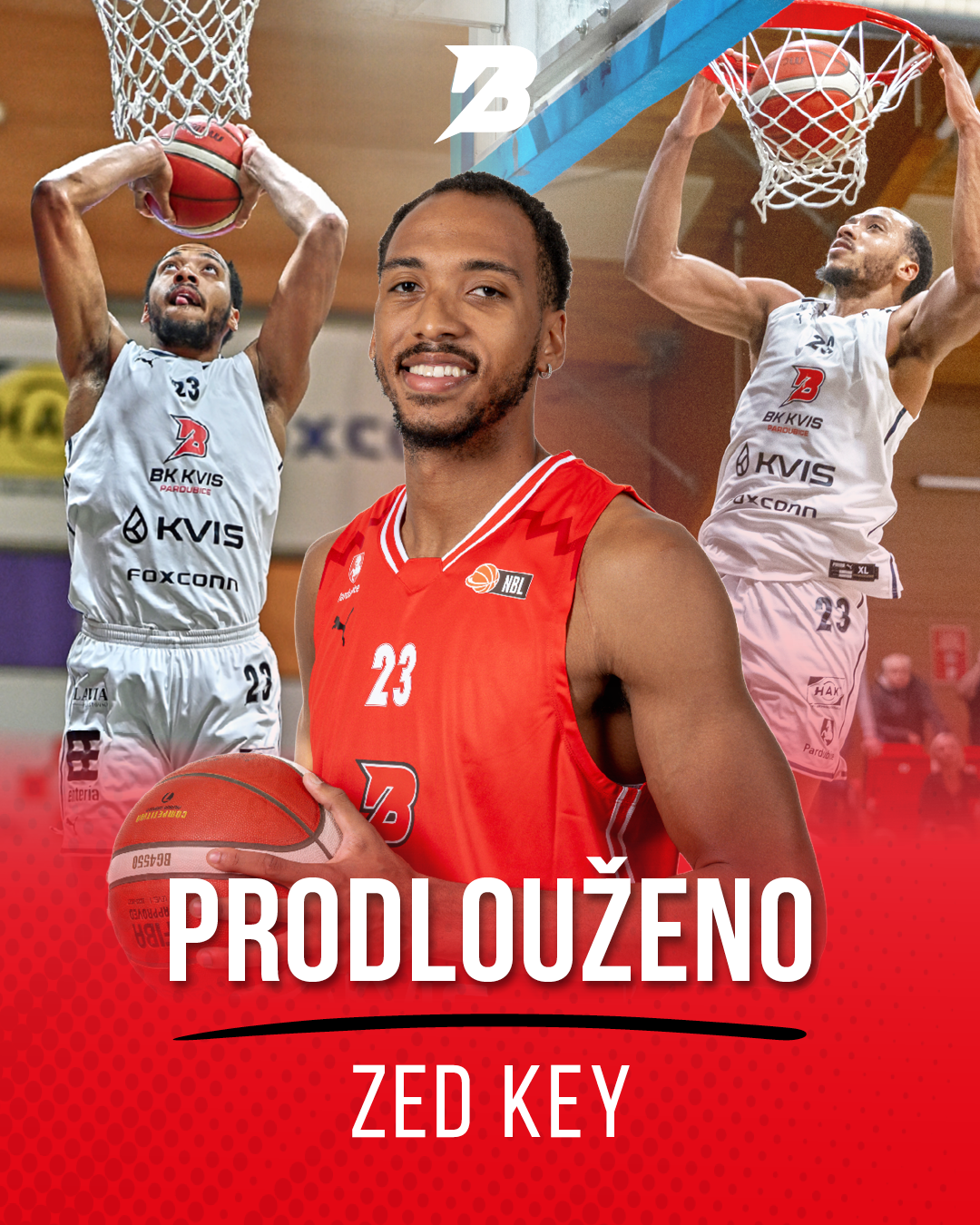 TISKOVÁ ZPRÁVA - Dalším hráčem stávajícího kádru, který prodloužil kontrakt s BK KVIS Pardubice i pro příští sezonu 2026/2027, je 24letý americký podkošový hráč Zed Key.